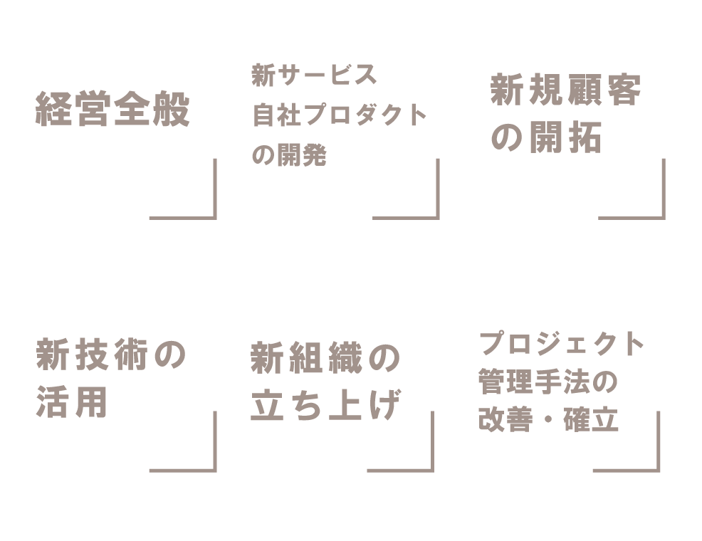 新規顧客の開拓や自社プロダクトの開発、新技術の活用など様々な課題の解決をいたします。